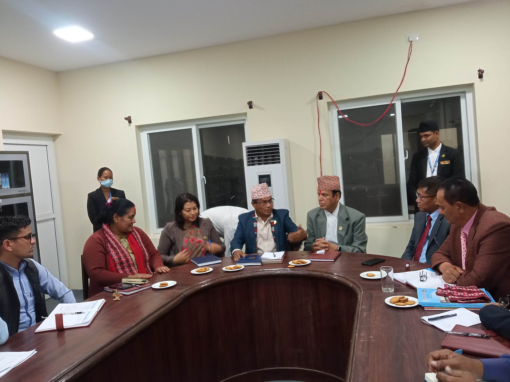 दाङ (राप्ती उपत्यका ) । अन्तर प्रदेश अवलोकन भ्रमणमा रहनु भएको बाग्मती प्रदेश सभाका सभामुख भुवन कुमार पाठक, उप सभामुख अप्सरा चापागाईं खत्री सचीव कृष्ण हरि खड्काको भ्रमण टाेलिले आज लुम्बिनी प्रदेश सभा भवनको अवलोकन गर्नुका साथै भेटबार्ता गर्नु भएको छ । उहाँहरुलाई लुम्बिनी प्रदेशका सभामुख तुलाराम घर्ती मगर, उप सभामुख मेनुका खाड केसी,सचीव दुर्लभ पुन मगरले स्वागत गर्नु भयो । बाग्मति प्रदेशका सभामुख पाठकले लुम्बिनी प्रदेशले नयाँ स्थानमा पनि राम्रो संग राजधानी ब्यावस्थापन गर्न सफल भएको बताउनु हुँदा प्रसम्सा गर्नु भयो । उहाँले भन्नुभयो – “सभाको संरचना सोचे भन्दा राम्रो भएछ । यो हाम्रो प्रदेशले पनि सिक्नयोग्य छ ।” लुम्बिनी प्रदेशका सभामुख घर्ती मगरले कानुन निर्माण र सभाको कार्य सम्पादनमा अन्तर प्रदेश भ्रमणले टेवा पुर्याउने बिश्वास व्यक्त गर्नु भयो । सो अवसरमा बाग्मती प्रदेशका सभामुख पाठकले लुम्बिनी प्रदेशका माननीय सभामुख, उपसभामुखलाइ भ्रमणको लागी औपचारिक निम्ता दिनु भयो ।
