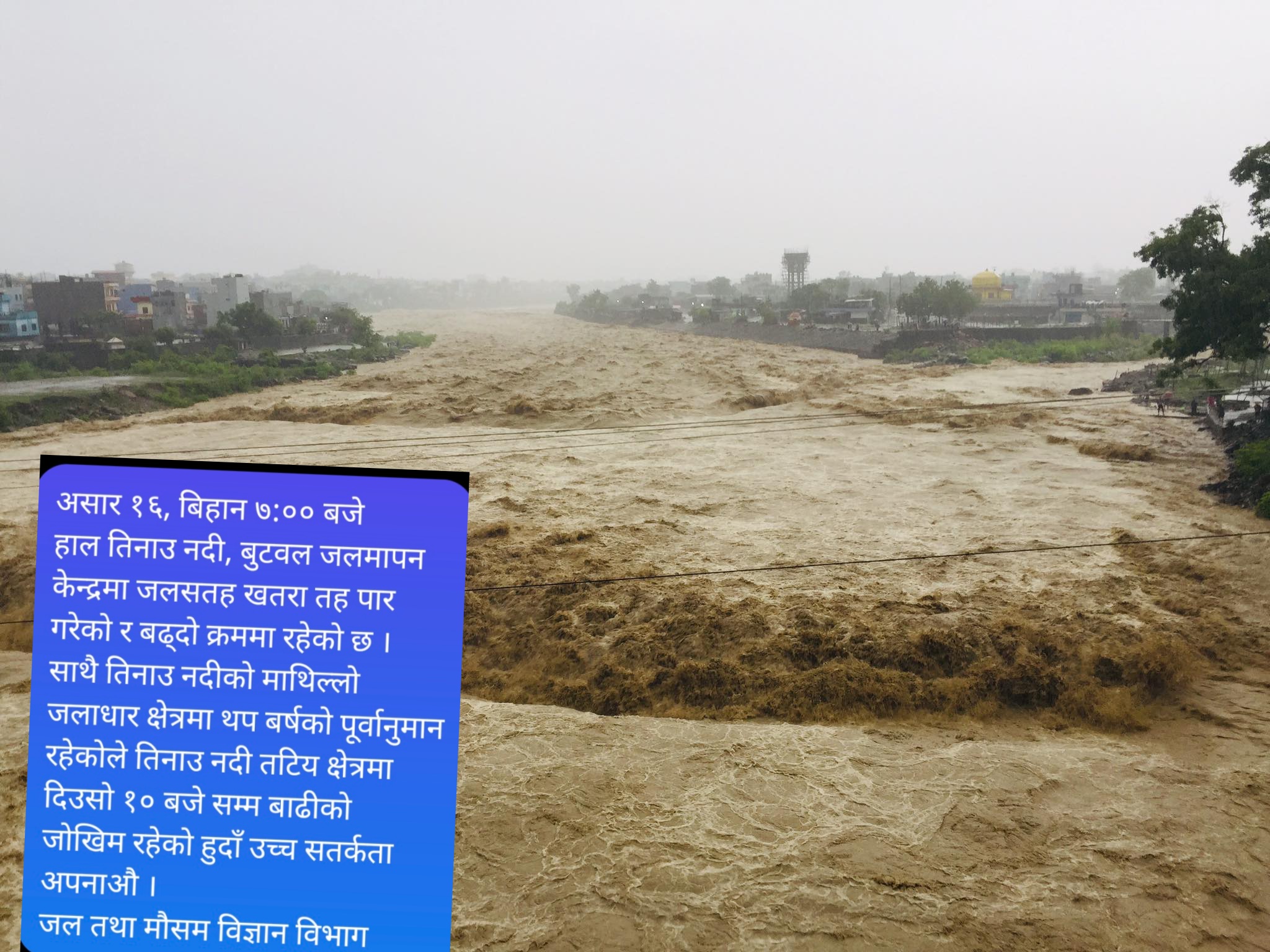 बुटवल । रुपन्देही, पाल्पा लगायत आसपासका जिल्लामा निरन्तरको वर्षासँगै तिनाउ नदीमा जलसतले सतर्कता तह पार गर्ने चेतावनी दिइएको छ । बाढी मापदन केन्द्र बुटवलले सुचना जारी गर्दै पछिल्लो ३ घन्टा तिनाउ जलाधारको बुटवल, पाल्पा र आसपासका क्षेत्रमा ठूलो वर्षा भई तटिय क्षेत्रमा बाढीको जोखिम बढेको छ ।