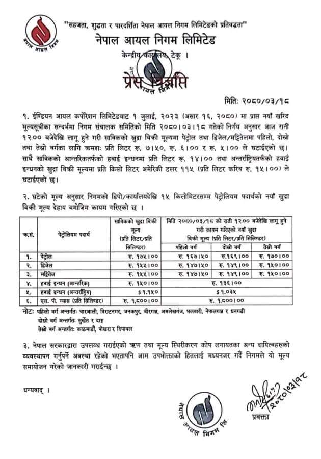 निगमका अनुसार पेट्रोल तथा डिजेल/मट्टितेलमा पहिलो, दोस्रो तथा तेस्रो वर्गका लागि क्रमशः प्रतिलिटर ७.५० रुपैयाँ, ६ रुपैयाँ र ५ रुपैयाँले घटाइएको छ । यसअनुसार पेट्रोल भारतसँगको सीमावर्ती क्षेत्रमा प्रतिलिटर १६७ रुपैयाँ ५० पैसादेखि काठमाडौं पोखरा र दिपायल क्षेत्रमा १७० रुपैयाँसम्म कायम भएको छ । डिजेल र मट्टितेलमा १४७ रुपैयाँ ५० पैसादेखि १५० रुपैयाँसम्म मूल्य कायम भएको छ ।