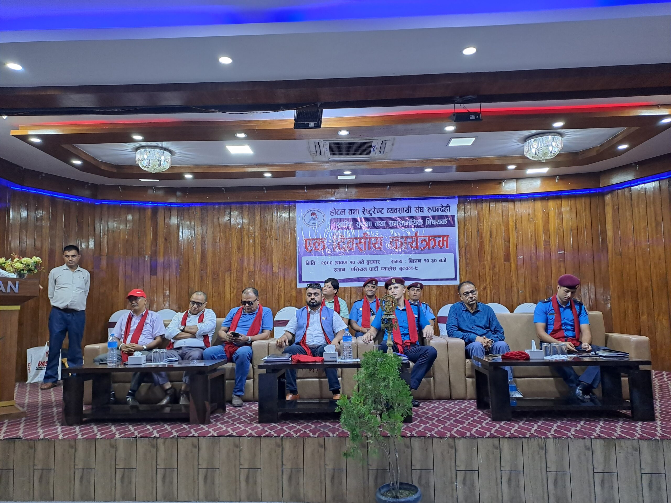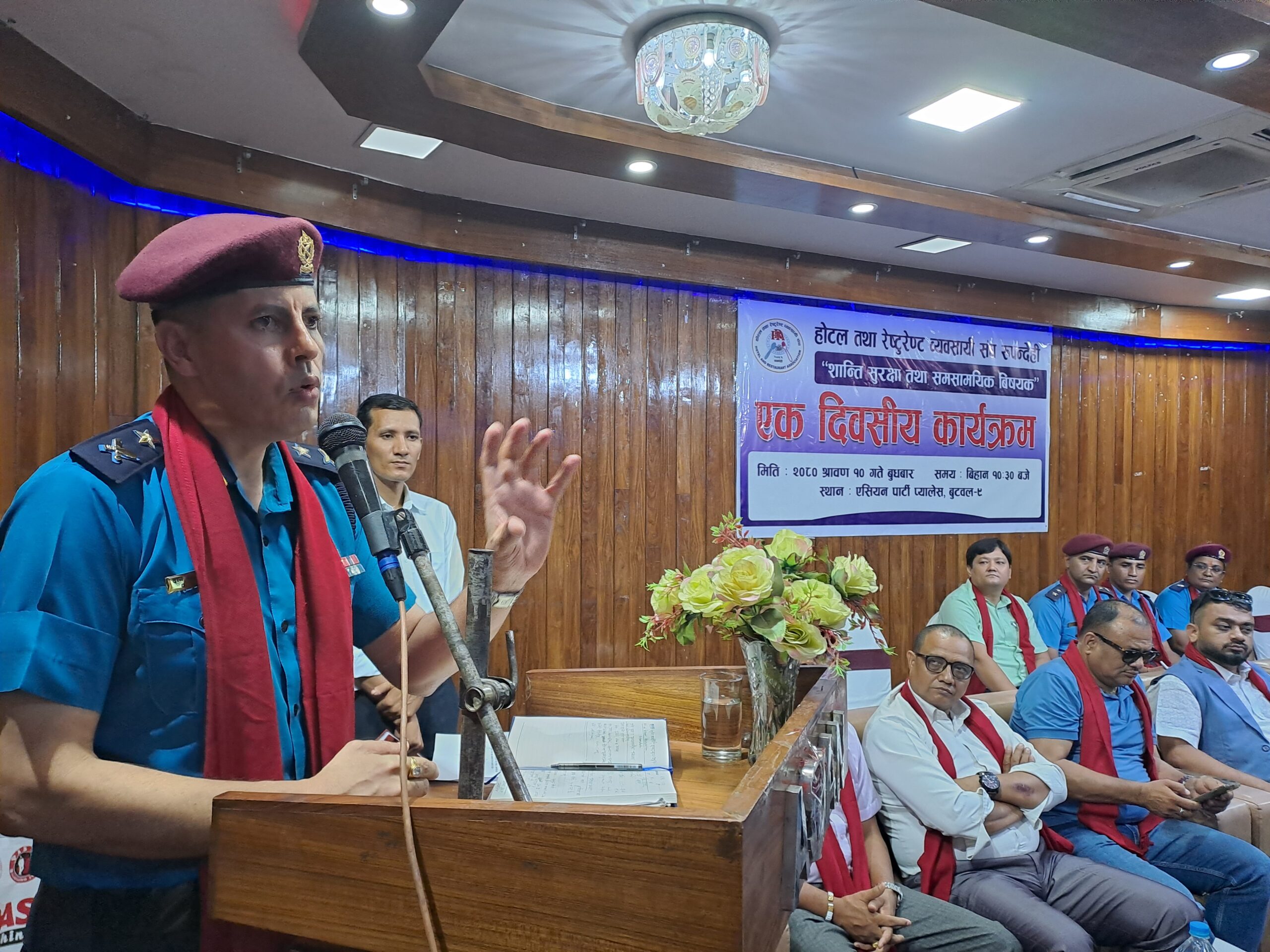 कार्यक्रमको उद्घाटन गर्दै इलाका प्रहरी कार्यालय बुटवलका प्रहरी नायब उपरिक्षक दान बहादुर थापाले शान्ति सुरक्षा साझा उद्देश्य भए मात्र कार्यान्वयन सहज हुने बताए । प्रविधिमैत्री साधनश्रोत बिना शान्तिसुरक्षा सहज नहुने उनले बताए । अपराध घट्नका लागि बदनियत राख्ने, सामथ्र्य र अवसर तीन मुख्य कुरा हुनुपर्ने बताए । अवसर खोज्न होटल, रेष्टुरेन्टलाई रोज्ने गरिएको उनले दाबी गरे । गोपनियता महत्वपूर्ण हुने भन्दै होटल ब्यवसायीहरुको ग्राहकको बिवरणप्रति प्रहरी प्रशासन र सुरक्षा हितबाहेक गोप्य राख्ने दायित्वमा पर्ने बताए । रात्रिकालिन ब्यवसायीहरुको बिरोधी नभएको दाबी गर्दै उनले समुदाय अनुसार यो संचालन गर्न मिल्ने बताए । ‘हामी कुन सोसियो कल्चरमा छौ भन्ने कुरा महत्वपूर्ण छ’— उनले भने । धेरै जिल्लाबाट बसाईसराई भएर आएको विविध क्षेत्रका बसोबासी रहेको तथा बैमन्यश्यतालाई पूरा गर्ने अवसरका रुपमा लिने गरिदा रात्रीकालिन ब्यवसायमा समस्या देखिएको उनले बताए । प्रहरी सधै कानुन कार्यान्वयन गर्ने पक्षमा ३ वटा पीलाई कार्यान्वयन गर्ने बताए । शान्ति सुरक्षा, अमनचयन कायम गर्नका लागि प्रवद्र्धनात्मक गतिविधि, निरोधात्मक विधि र दण्डनात्मक नीति लागु गर्ने उनले बताए । आर्थिक अनुसासन नीतिलाई पुर्ण रुपमा कार्यान्वयन गरिने प्रतिवद्धता जनाउदै उनले जिरो टोलोरेन्स कायम गर्ने बताए । सम्बन्धलाई रुख र जराजस्तै हुने उदाहरण दिदै उनले प्रहरी र होटल ब्यवसायीहरुको सम्बन्धलाई यसरी नै ब्यवहारमा लागु गर्न अग्रह गरे । सामाजिक सजाल अरुलाई होच्याउने गरि प्रयोग भएको उनको गुनासो छ । थोरै प्रतिशत गलतबाट ठूलो समुहलाई दबाउने काम हुने गरेको उनले बताए । अतिबाद हुने ठाउमा शान्ति नहुने भन्दै उनले आफुले आफैलाई नियन्त्रण गर्न सक्नुपर्ने बताए । सामाजिक सद्घाव र चिन्तनलाई सोच्नुपर्ने बेला भएको बताए ।