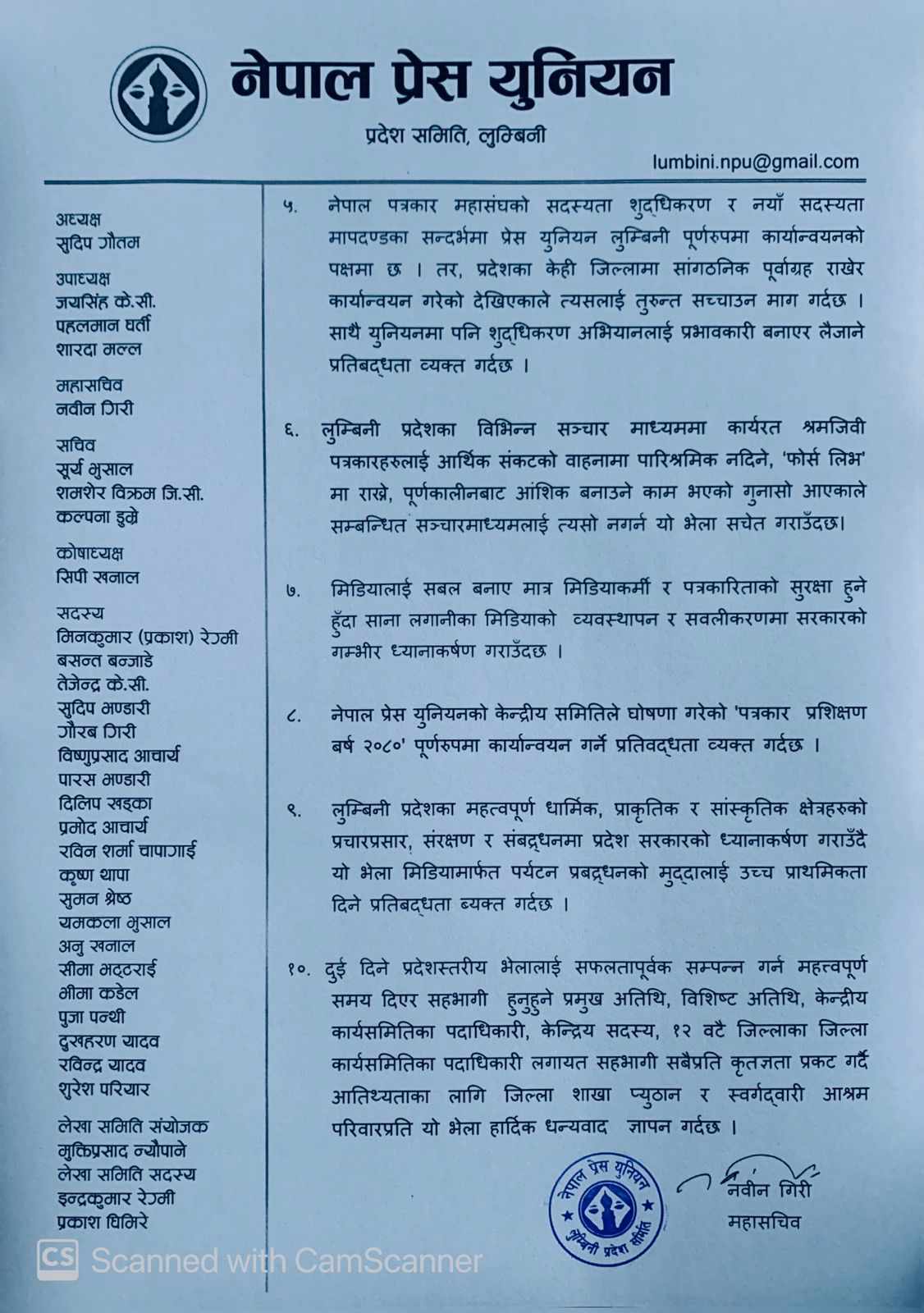 यसैगरी नेपाल प्रेस युनियनको केन्द्रीय समितिले घोषणा गरेको ‘पत्रकार प्रशिक्षण बर्ष २०८०’ पूर्णरुपमा कार्यान्वयन गर्ने प्रतिवद्धता ब्यक्त गरिएको छ । लुम्बिनी प्रदेशका महत्वपूर्ण धार्मिक, प्राकृतिक र सांस्कृतिक क्षेत्रहरुको प्रचारप्रसार, संरक्षण र संबद्र्धनमा प्रदेश सरकारको ध्यानाकर्षण गराउँदै मिडियामार्फत पर्यटन प्रबद्र्धनको मुद्दालाई उच्च प्राथमिकता दिने प्रतिबद्धता जनाइएको छ ।
