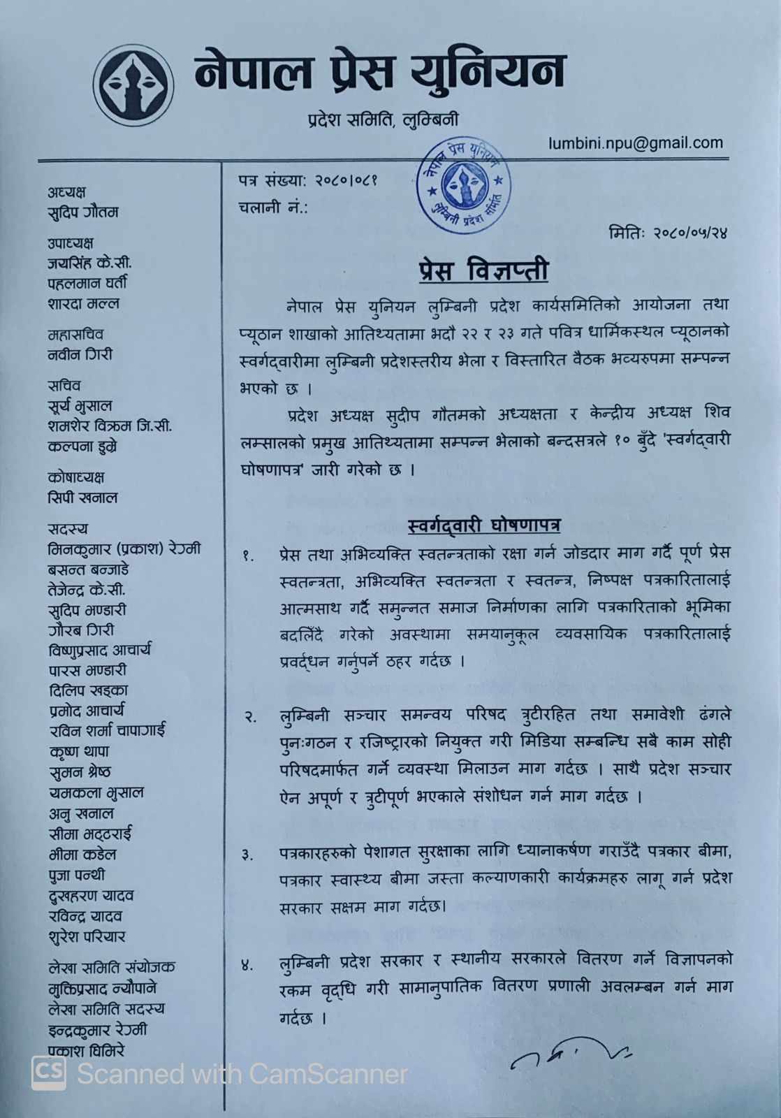महासचिव नवीन गिरीद्वारा जारी प्रेस विज्ञप्तीमा प्रदेश भेला १० बुँदे घोषणापत्र जारी गरेर सम्पन्न भएको उल्लेख छ । भेलाले प्रेस तथा अभिव्यक्ति स्वतन्त्रताको रक्षा गर्न जोडदार माग गर्दै पूर्ण प्रेस स्वतन्त्रता, अभिव्यक्ति स्वतन्त्रता र स्वतन्त्र, निष्पक्ष पत्रकारितालाई आत्मसाथ गरी समुन्नत समाज निर्माणका लागि पत्रकारिताको भूमिका बदलिँदै गरेको अवस्थामा समयानुकूल व्यवसायिक पत्रकारितालाई प्रवर्द्धन गर्नुपर्ने ठहर गरेको विज्ञप्तीमा उल्लेख गरिएको छ । यस्तै लुुम्बिनी सञ्चार समन्वय परिषद त्रुटीरहित तथा समावेशी ढंगले पुनःगठन र रजिष्ट्रारको नियुक्त गरी मिडिया सम्बन्धि सबै काम सोही परिषदमार्फत गर्ने व्यवस्था मिलाउन माग गर्दै प्रदेश सञ्चार ऐन अपूर्ण र त्रुटीपूर्ण भएकाले संशोधन गर्न भनिएको छ ।