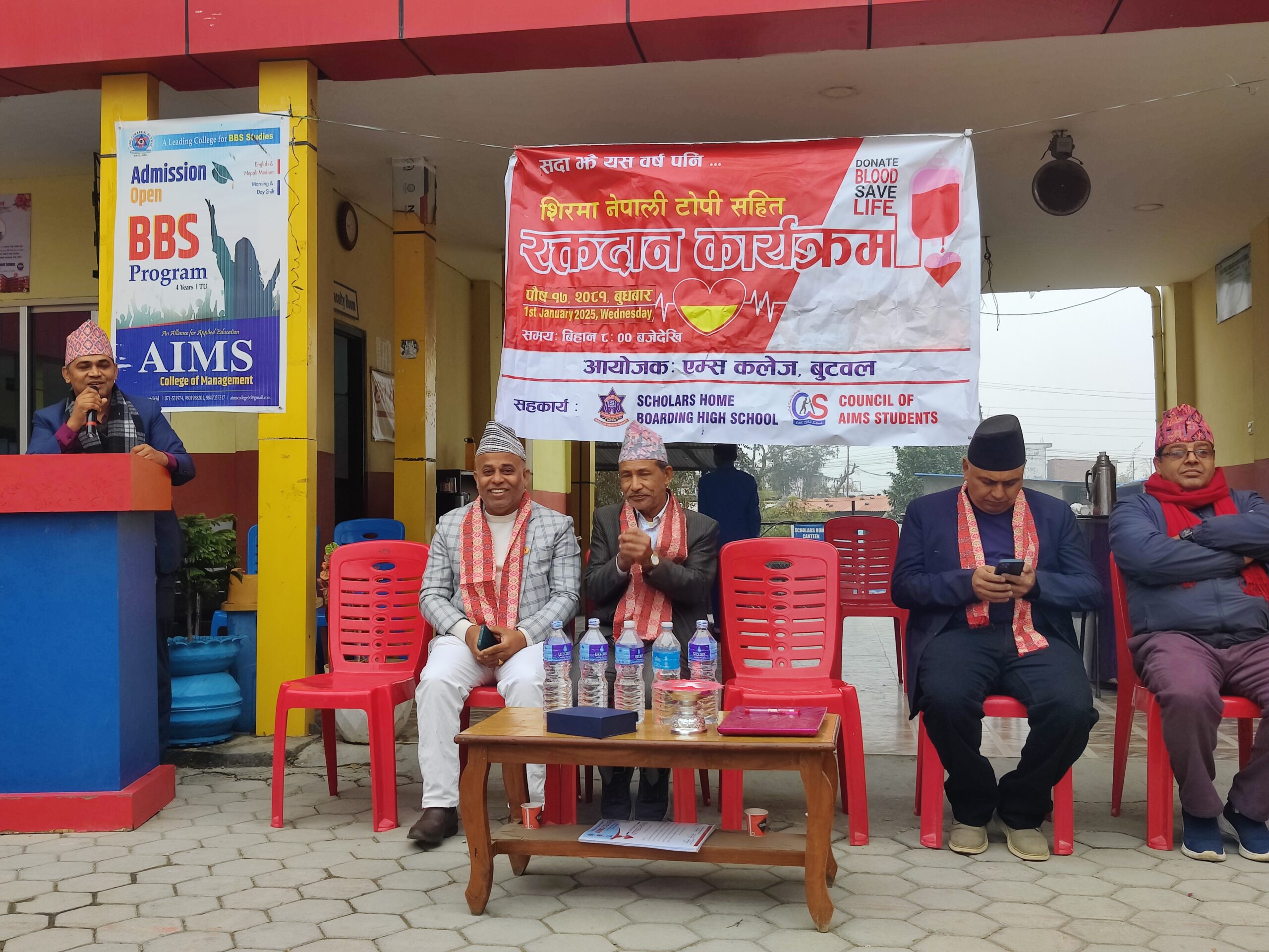 बुटवल, १८ पुस । एम्स कलेज बुटवलको आयोजनामा बुटवलमा नवौ शरिमा नेपाली टोपीसहित रक्तदान कार्यक्रम सम्पन्न भएको छ । स्कलर्स होम बोर्डिङ स्कुल र काउन्सिल अफ एम्सको सहकार्य तथा नेपाल रेडक्रस सोसाइटी, रक्तसंचार केन्द्र बुटवलको प्राविधिक सहयोगमा कलेज परिसरमा बुधबार वृहत रक्तदान कार्यक्रम गरिएको हो ।