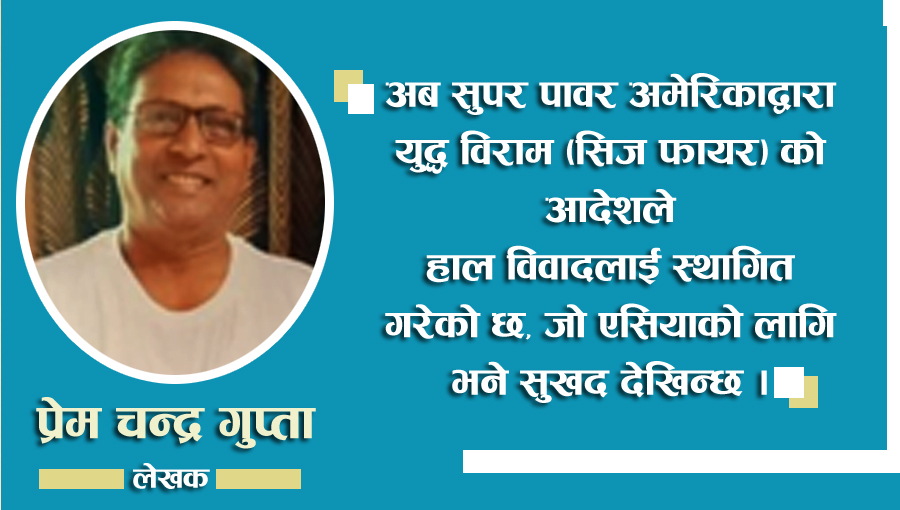 अब सुपर पावर अमेरिकाद्वारा युद्ध विराम (सिज फायर)को आदेशले हाल विवादलाई स्थागित गरेको छ, जो एसियाको लागि भने सुखद देखिन्छ । भारत पाकिस्तान जस्ता, न्यूकिलियर पावर धारकहरूको भयावह प्रकोपबाट अमेरिकाले बचाएर द्वितीय विश्व युद्ध पछि पुनःसाँच्चै सुपर पावर प्रमाणित भई एसियालाई एक नयाँ युगमा प्रवेश गराएको आधिकारीक पुष्टि भएको छ । अतः वर्तमान भारत पाकिस्तान विवादमा नेपालको ठोस र उल्लेखनीय निर्णय तथा अमेरिकी कदम द्धारा सिज फायर ले एसिया,प्रशान्त क्षेत्रमाशान्ति स्थापना र खुसियाली हाम्रो लागि के साँच्चै एक उज्जवल भविष्यको दिशानिर्देश हो ?