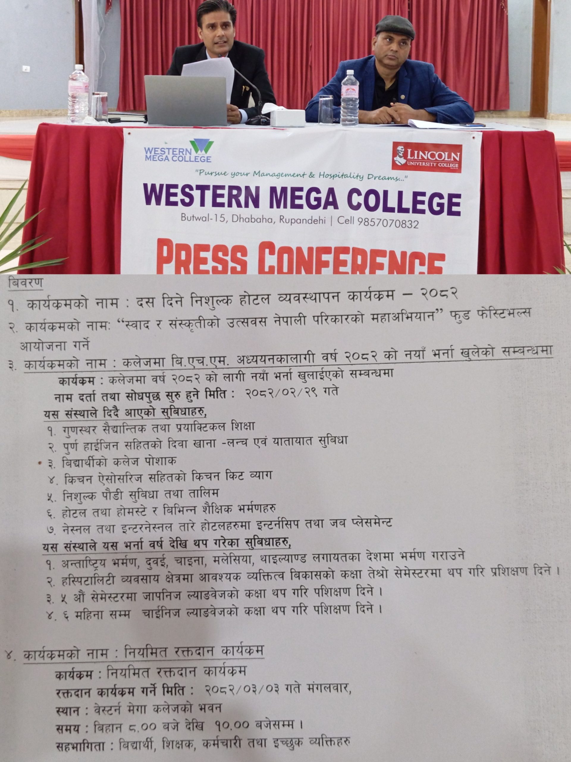 प्राचार्य अधिवक्ता किसु शर्माले बिहीबार पत्रकार सम्मेलनमार्फत कलेज परिसरमै विविध कार्यक्रम घोषणा गर्दै असार १ गतेदेखि कक्षा १२ उत्तीर्ण विद्यार्थीहरूका लागि १० दिने पूर्णरूपले निःशुल्क होटल व्यवस्थापन तालिम सञ्चालन गर्ने जानकारी दिनुभयो ।