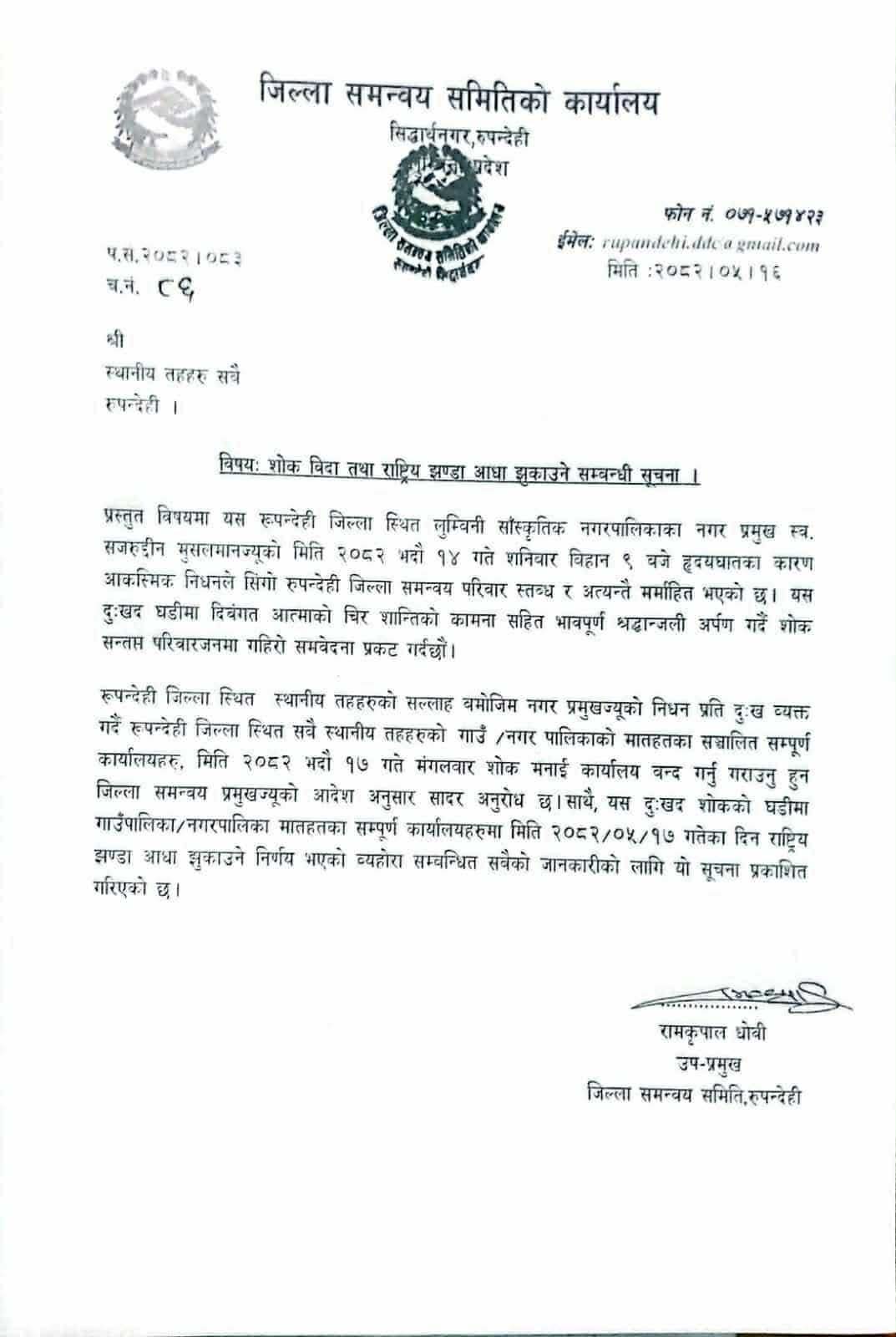 रुपन्देहीमा मंगलबार शोक बिदा, राष्ट्रिय झण्डा आधा झुकाउने निर्णय