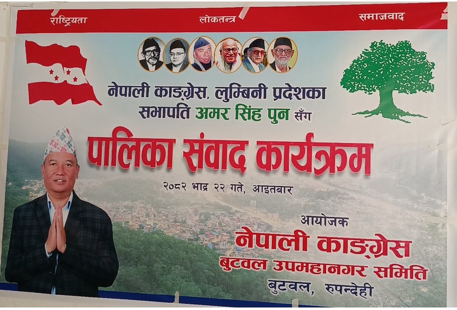 रुपन्देही क्षेत्र नम्बर–३ मा नेपाली कांग्रेस बुटवलले आयोजना गरेको पालिका संवाद कार्यक्रम लुम्बिनी प्रदेश सभापति अमरसिंह पुनले उद्घाटन गर्नुभयो। उहाँले यो संवाद जनप्रतिनिधि र पार्टीबीचको सम्बन्ध अझ सुमधुर बनाउन कोसेढुङ्गा हुने विश्वास व्यक्त गर्नुभयो।