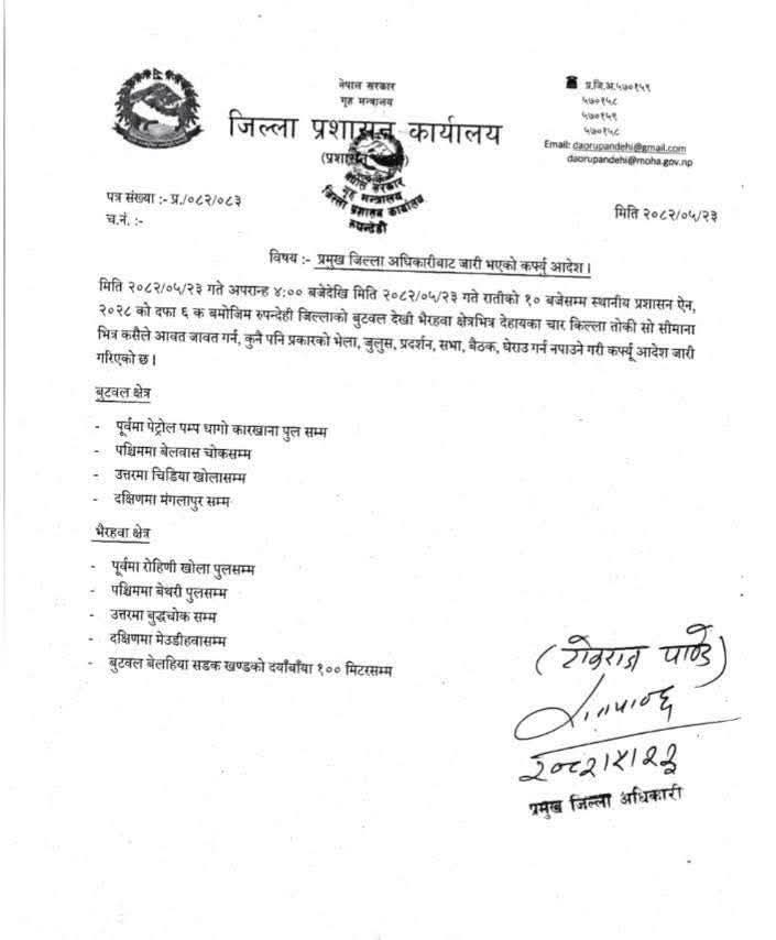 रुपन्देही प्रशासनले बुटवल तथा भैरहवाका विभिन्न क्षेत्रमा निषेधाज्ञा जारि गरेको छ। जिल्ला प्रशासन कार्यालय रुपन्देहीले सार्वजनिक सूचना जारी गर्दै भदौ २३ गते दिउँसो ४ बजेदेखि रातिको १० बजेसम्म लागू हुने गरी निषेधाज्ञा जारी गरेको हो।