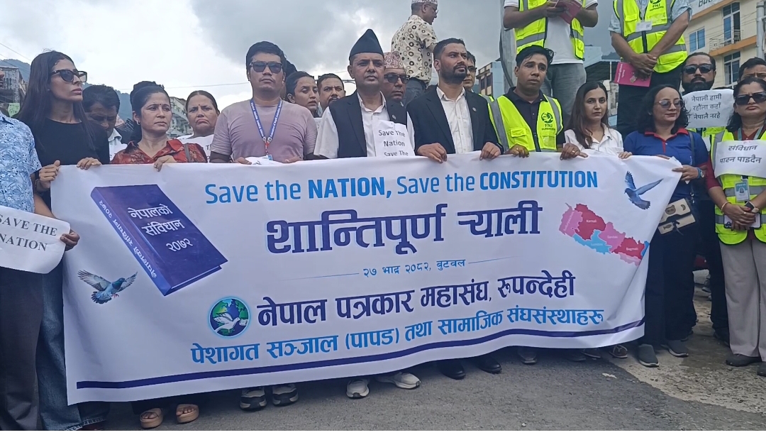 बुटवलमा नेपाल पत्रकार महासंघ रुपन्देहीको अगुवाइमा पेशागत सञ्जाल, पापड तथा विभिन्न सामाजिक संघ–संस्थाको सहभागितामा ‘सेभ द नेशन, सेभ द कन्स्टिच्युसन’ भन्ने मूल नारासहित र्‍याली निकालिएको हो। राजमार्ग चौराहाबाट सुरु भएको र्‍याली ट्राफिकचोक पुगेर समापन भएको थियो।